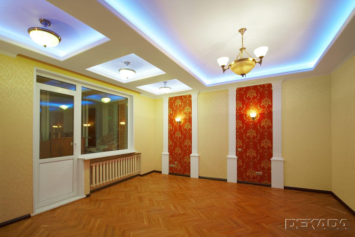 Ремонт квартиры выполнен по дизайн-проекту с 3-d визуализациями помещений. Квартира 70-х годов постройки, нестандартной планировки. В процессе работы был произведен частичный демонтаж перегородок. Произведен полный ремонт под ключ с заменой всех инженерных систем. Паркетный пол - восстановлен и покрыт лаком. Отделка - в соответствии с дизайн-проектом, с больших количеством декоративных элементов, в т.ч. колонн, потолков, стеллажей. Обратите внимание на оригинальное решение основного света и различных видов декоративного и локального освещения.